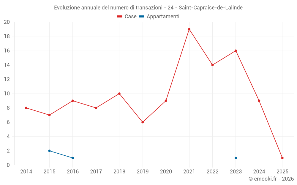 Il prezzo mediano sulle 21 transazioni di case degli ultimi 24 mesi nel comune di Saint-Capraise-de-Lalinde era di 1 400 € al metro quadrato per un valore patrimoniale mediano di 110 000 €. In questo periodo il 60% delle transazioni era tra 689 e 1 808 € al metro quadrato (dal 2° all'8° decile).