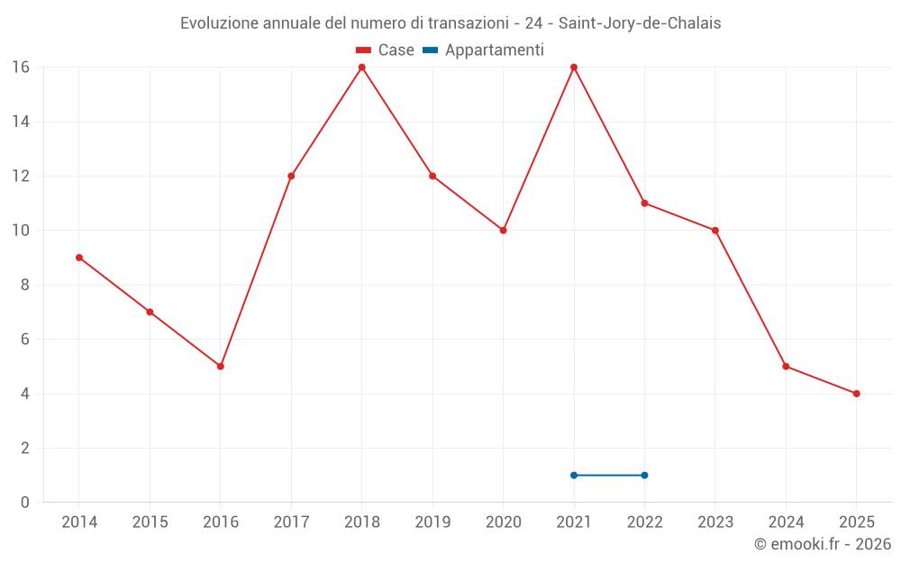 Il prezzo mediano sulle 14 transazioni di case degli ultimi 24 mesi nel comune di Saint-Jory-de-Chalais era di 1 701 € al metro quadrato per un valore patrimoniale mediano di 133 000 €. In questo periodo il 60% delle transazioni era tra 890 e 2 261 € al metro quadrato (dal 2° all'8° decile).