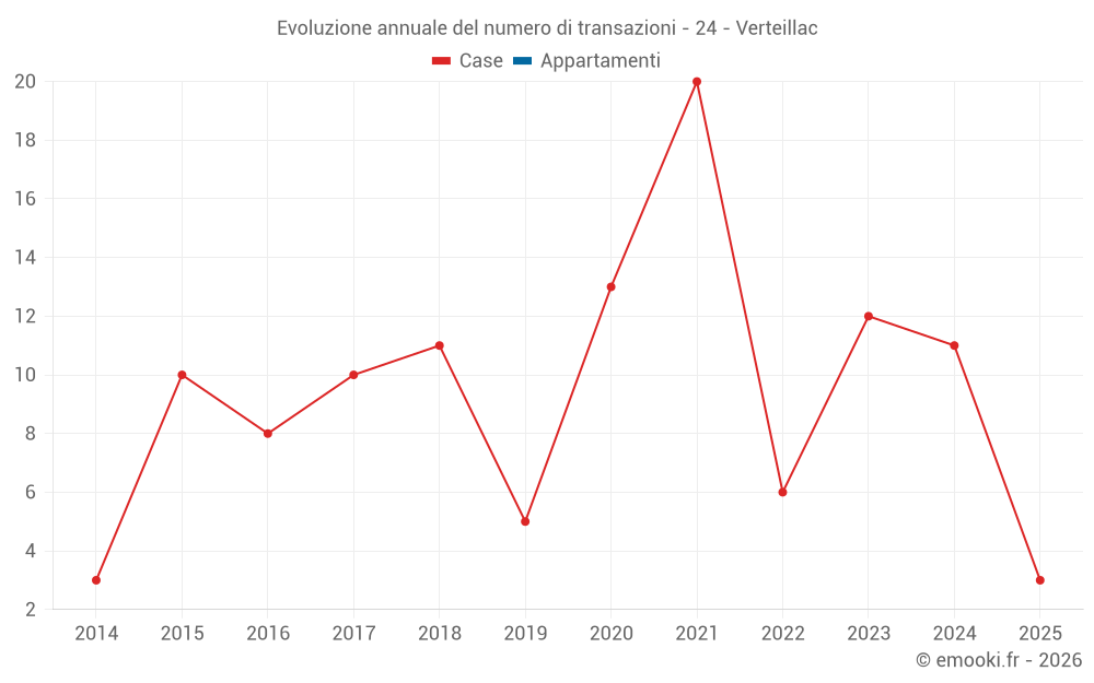 Il prezzo mediano sulle 17 transazioni di case degli ultimi 24 mesi nel comune di Verteillac era di 1 081 € al metro quadrato per un valore patrimoniale mediano di 110 826 €. In questo periodo il 60% delle transazioni era tra 505 e 1 572 € al metro quadrato (dal 2° all'8° decile).