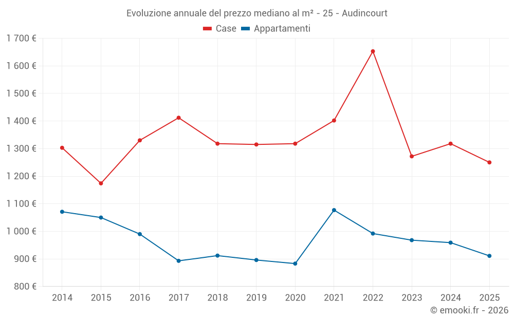 Il prezzo mediano sulle 25 transazioni di case degli ultimi 6 mesi nel comune di Audincourt era di 1 250 € al metro quadrato per un valore patrimoniale mediano di 118 480 €. In questo periodo il 60% delle transazioni era tra 818 e 1 809 € al metro quadrato (dal 2° all'8° decile).