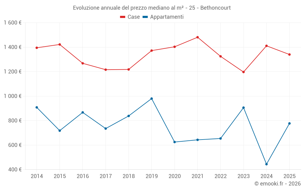 Il prezzo mediano sulle 21 transazioni di case degli ultimi 12 mesi nel comune di Bethoncourt era di 1 394 € al metro quadrato per un valore patrimoniale mediano di 103 650 €. In questo periodo il 60% delle transazioni era tra 768 e 1 885 € al metro quadrato (dal 2° all'8° decile).