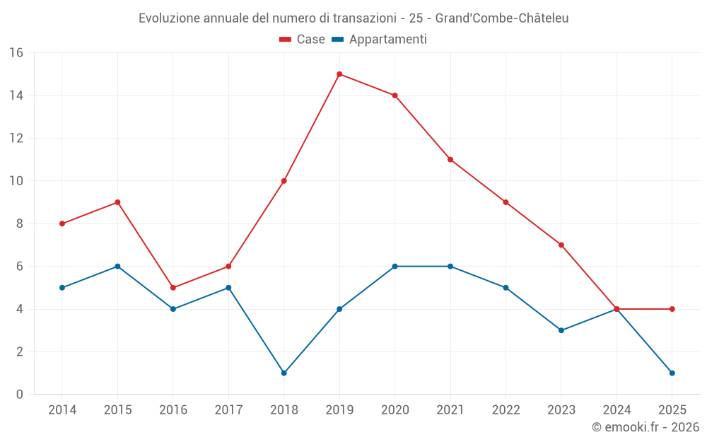 Il prezzo mediano sulle 14 transazioni di case degli ultimi 24 mesi nel comune di Grand'Combe-Châteleu era di 2 773 € al metro quadrato per un valore patrimoniale mediano di 333 795 €. In questo periodo il 60% delle transazioni era tra 2 097 e 3 362 € al metro quadrato (dal 2° all'8° decile).