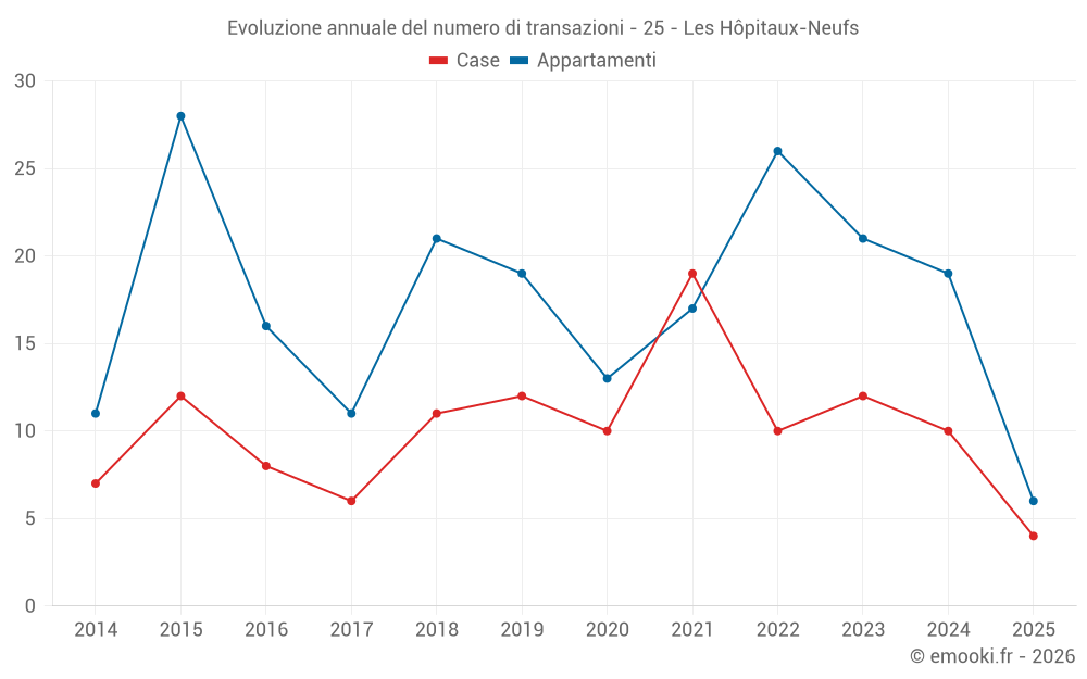 Il prezzo mediano sulle 19 transazioni di appartamenti degli ultimi 12 mesi nel comune di Les Hôpitaux-Neufs era di 3 045 € al metro quadrato per un valore patrimoniale mediano di 140 000 €. In questo periodo il 60% delle transazioni era tra 2 479 e 3 610 € al metro quadrato (dal 2° all'8° decile).