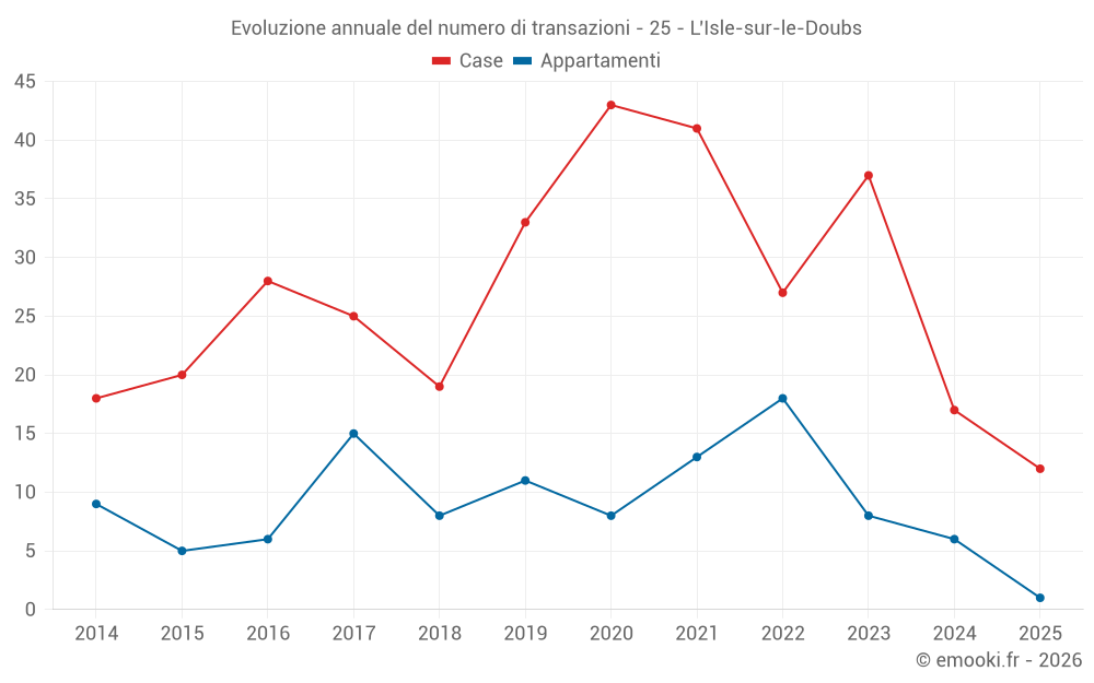 Il prezzo mediano sulle 19 transazioni di case degli ultimi 12 mesi nel comune di L'Isle-sur-le-Doubs era di 921 € al metro quadrato per un valore patrimoniale mediano di 62 500 €. In questo periodo il 60% delle transazioni era tra 484 e 1 190 € al metro quadrato (dal 2° all'8° decile).