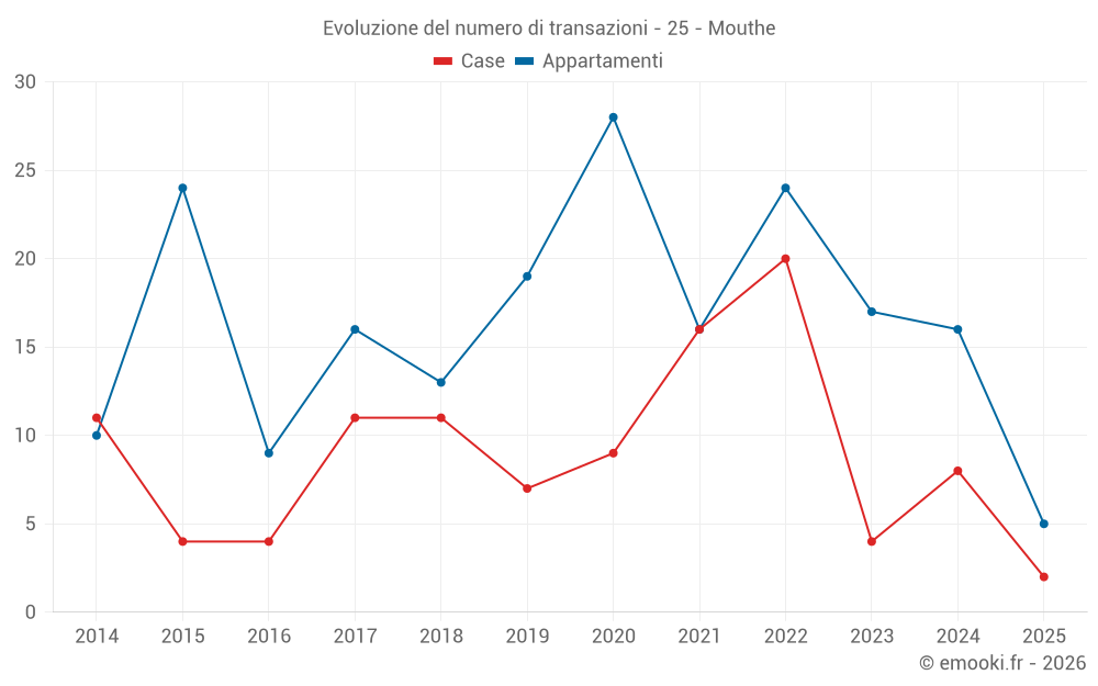 Il prezzo mediano sulle 30 transazioni di appartamenti degli ultimi 24 mesi nel comune di Mouthe era di 2 116 € al metro quadrato per un valore patrimoniale mediano di 137 000 €. In questo periodo il 60% delle transazioni era tra 1 584 e 2 614 € al metro quadrato (dal 2° all'8° decile).