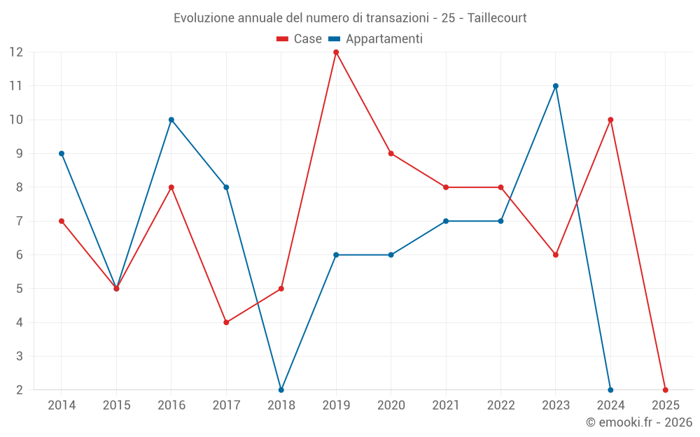 Il prezzo mediano sulle 16 transazioni di case degli ultimi 24 mesi nel comune di Taillecourt era di 1 846 € al metro quadrato per un valore patrimoniale mediano di 180 000 €. In questo periodo il 60% delle transazioni era tra 1 446 e 2 278 € al metro quadrato (dal 2° all'8° decile).