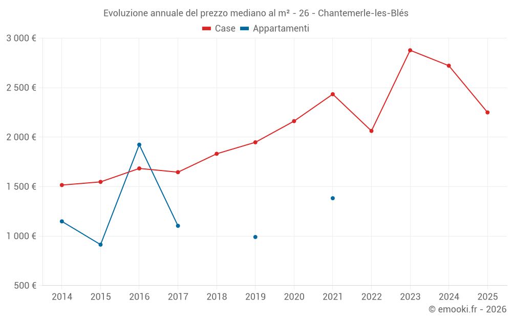 Il prezzo mediano sulle 15 transazioni di case degli ultimi 24 mesi nel comune di Chantemerle-les-Blés era di 2 523 € al metro quadrato per un valore patrimoniale mediano di 257 000 €. In questo periodo il 60% delle transazioni era tra 1 784 e 3 067 € al metro quadrato (dal 2° all'8° decile).