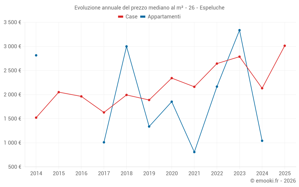 Il prezzo mediano sulle 19 transazioni di case degli ultimi 24 mesi nel comune di Espeluche era di 2 317 € al metro quadrato per un valore patrimoniale mediano di 220 000 €. In questo periodo il 60% delle transazioni era tra 1 609 e 3 395 € al metro quadrato (dal 2° all'8° decile).