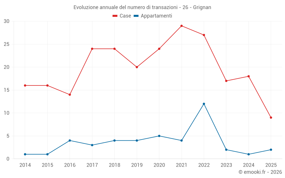 Il prezzo mediano sulle 19 transazioni di case degli ultimi 12 mesi nel comune di Grignan era di 3 333 € al metro quadrato per un valore patrimoniale mediano di 327 000 €. In questo periodo il 60% delle transazioni era tra 2 363 e 4 253 € al metro quadrato (dal 2° all'8° decile).