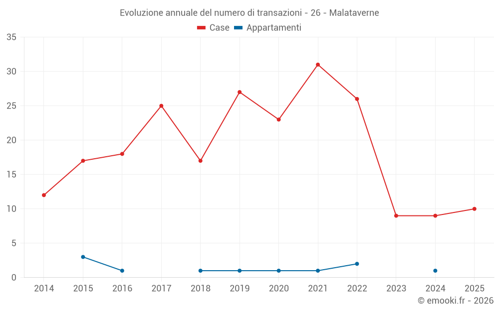 Il prezzo mediano sulle 24 transazioni di case degli ultimi 24 mesi nel comune di Malataverne era di 2 455 € al metro quadrato per un valore patrimoniale mediano di 250 000 €. In questo periodo il 60% delle transazioni era tra 1 907 e 3 167 € al metro quadrato (dal 2° all'8° decile).
