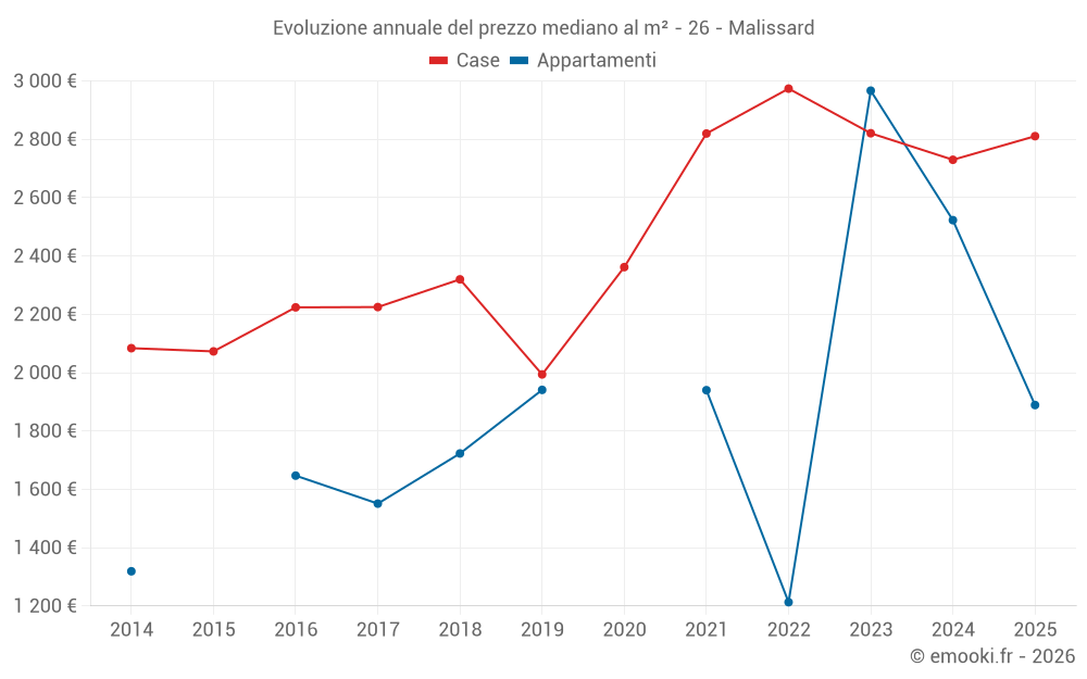 Il prezzo mediano sulle 16 transazioni di appartamenti degli ultimi 24 mesi nel comune di Malissard era di 2 905 € al metro quadrato per un valore patrimoniale mediano di 178 773 €. In questo periodo il 60% delle transazioni era tra 2 831 e 3 065 € al metro quadrato (dal 2° all'8° decile).