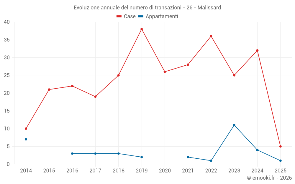 Il prezzo mediano sulle 21 transazioni di case degli ultimi 12 mesi nel comune di Malissard era di 2 811 € al metro quadrato per un valore patrimoniale mediano di 265 000 €. In questo periodo il 60% delle transazioni era tra 1 855 e 3 020 € al metro quadrato (dal 2° all'8° decile).