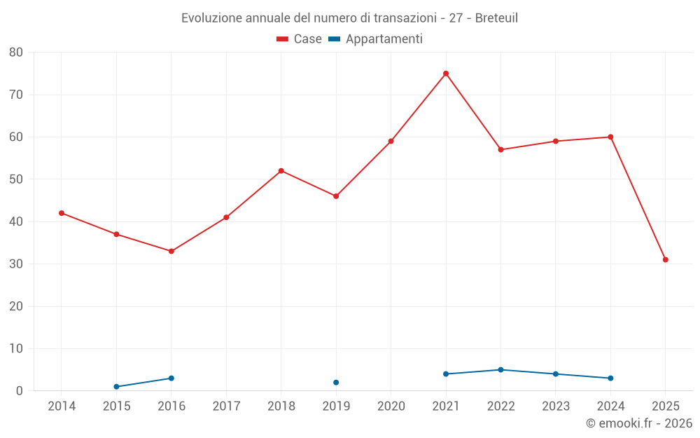 Il prezzo mediano sulle 31 transazioni di case degli ultimi 6 mesi nel comune di Breteuil era di 1 471 € al metro quadrato per un valore patrimoniale mediano di 130 000 €. In questo periodo il 60% delle transazioni era tra 1 024 e 1 775 € al metro quadrato (dal 2° all'8° decile).