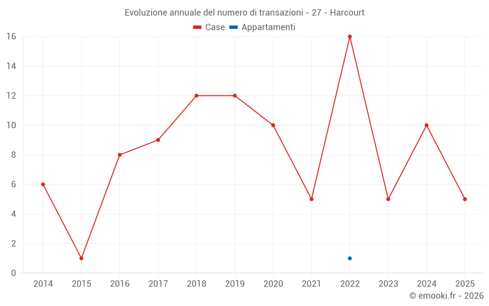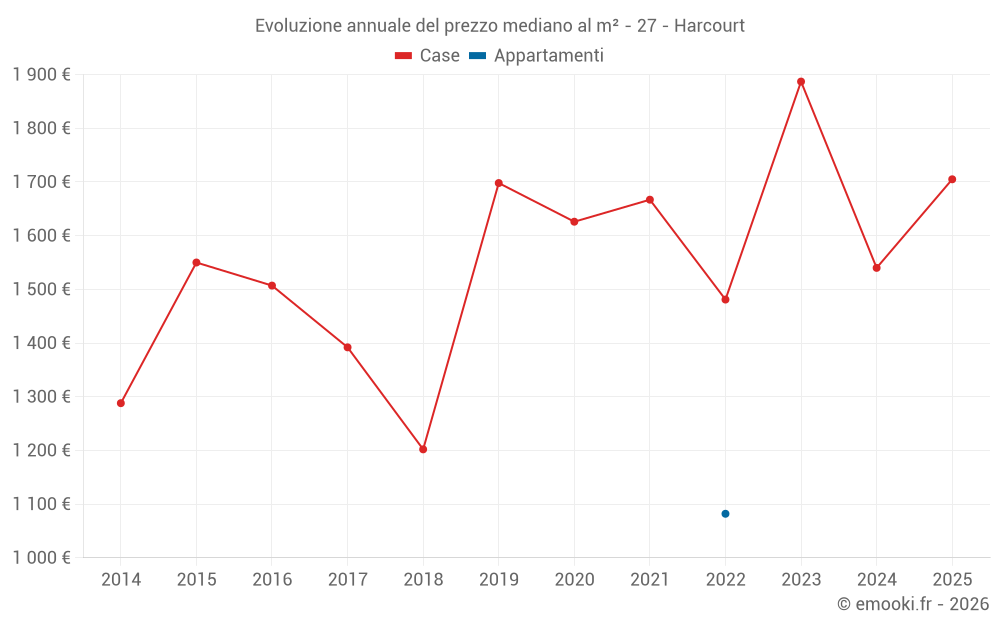 Il prezzo mediano sulle 16 transazioni di case degli ultimi 24 mesi nel comune di Harcourt era di 1 738 € al metro quadrato per un valore patrimoniale mediano di 154 750 €. In questo periodo il 60% delle transazioni era tra 1 250 e 2 187 € al metro quadrato (dal 2° all'8° decile).