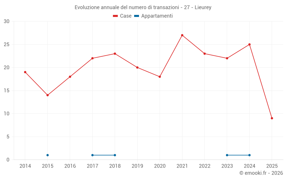 Il prezzo mediano sulle 21 transazioni di case degli ultimi 12 mesi nel comune di Lieurey era di 1 640 € al metro quadrato per un valore patrimoniale mediano di 138 000 €. In questo periodo il 60% delle transazioni era tra 1 043 e 2 143 € al metro quadrato (dal 2° all'8° decile).