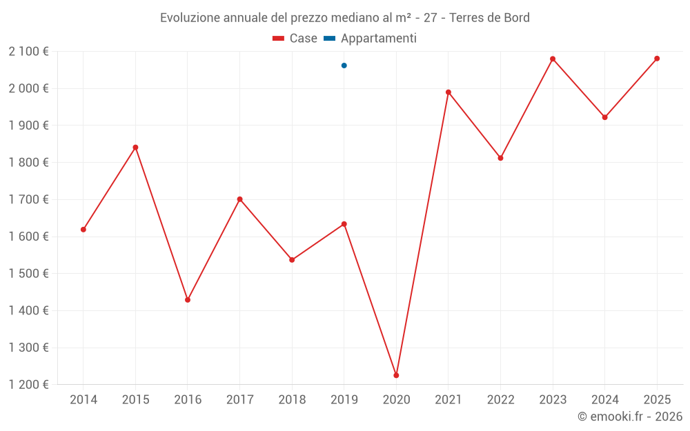 Il prezzo mediano sulle 33 transazioni di case degli ultimi 24 mesi nel comune di Terres de Bord era di 2 075 € al metro quadrato per un valore patrimoniale mediano di 200 000 €. In questo periodo il 60% delle transazioni era tra 1 211 e 2 488 € al metro quadrato (dal 2° all'8° decile).