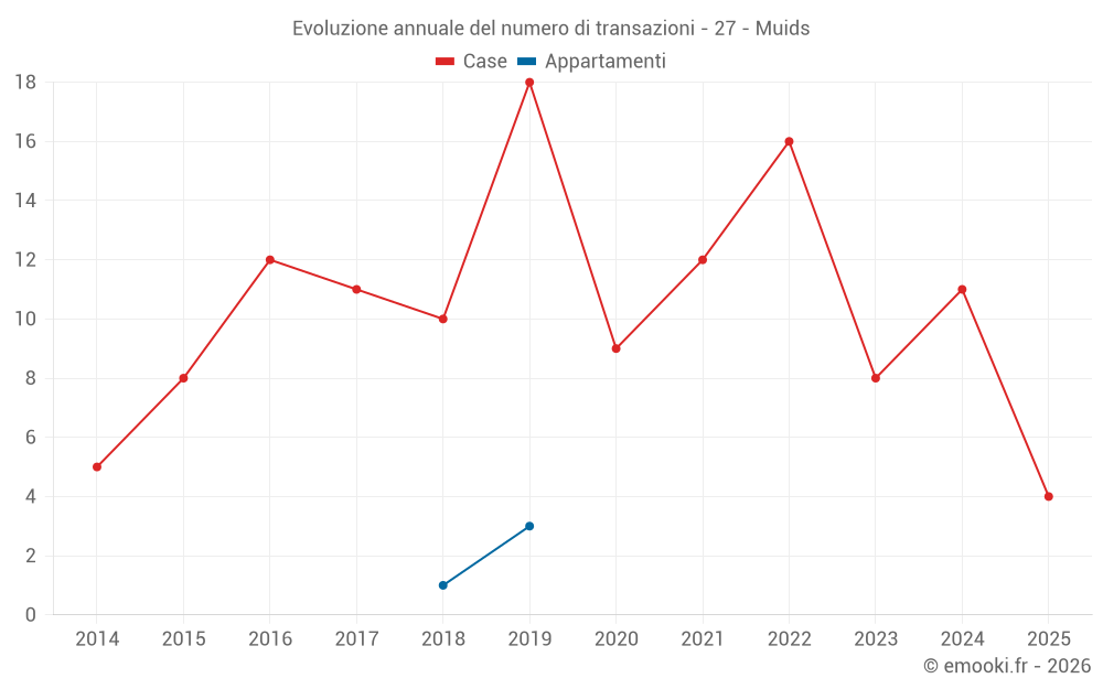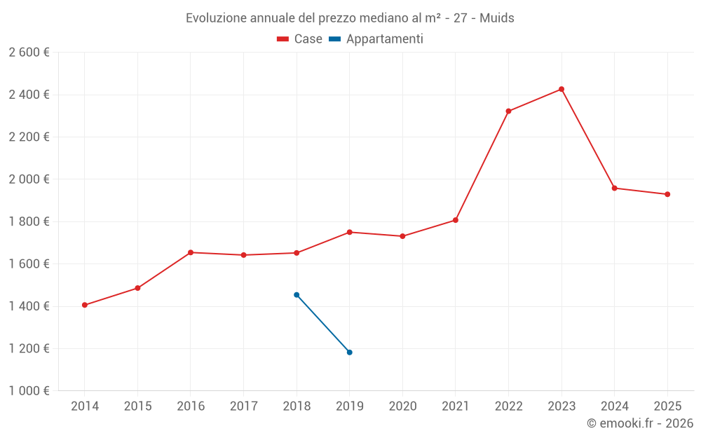 Il prezzo mediano sulle 17 transazioni di case degli ultimi 24 mesi nel comune di Muids era di 1 994 € al metro quadrato per un valore patrimoniale mediano di 176 000 €. In questo periodo il 60% delle transazioni era tra 1 610 e 2 751 € al metro quadrato (dal 2° all'8° decile).