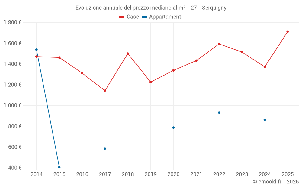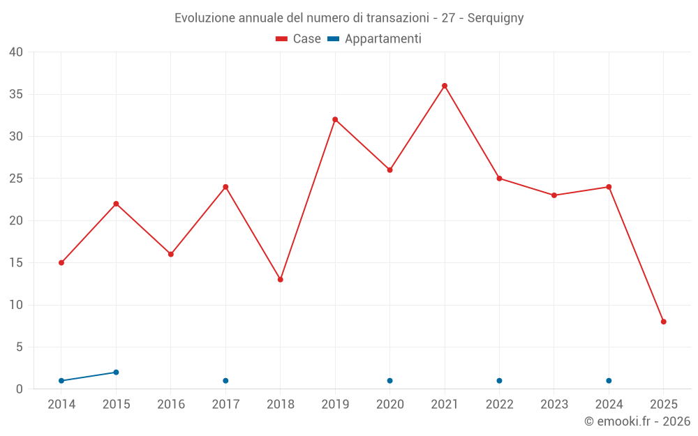 Il prezzo mediano sulle 23 transazioni di case degli ultimi 12 mesi nel comune di Serquigny era di 1 492 € al metro quadrato per un valore patrimoniale mediano di 125 000 €. In questo periodo il 60% delle transazioni era tra 1 222 e 1 940 € al metro quadrato (dal 2° all'8° decile).