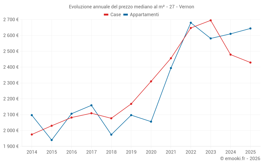Il prezzo mediano sulle 30 transazioni di appartamenti degli ultimi 3 mesi nel comune di Vernon era di 2 644 € al metro quadrato per un valore patrimoniale mediano di 112 500 €. In questo periodo il 60% delle transazioni era tra 2 009 e 3 066 € al metro quadrato (dal 2° all'8° decile).