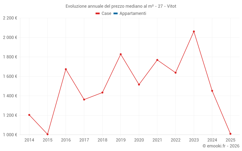 Il prezzo al m² delle case è diminuito del 51% da 2 anni, ma è aumentato del 0.5% in 10 anni.
