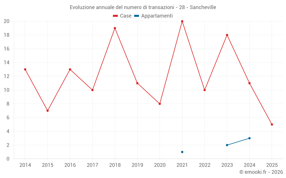 Il prezzo mediano sulle 21 transazioni di case degli ultimi 24 mesi nel comune di Sancheville era di 1 365 € al metro quadrato per un valore patrimoniale mediano di 98 000 €. In questo periodo il 60% delle transazioni era tra 930 e 1 880 € al metro quadrato (dal 2° all'8° decile).