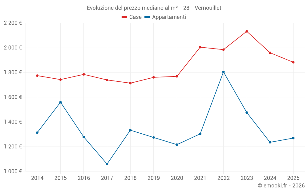 Il prezzo mediano sulle 21 transazioni di case degli ultimi 6 mesi nel comune di Vernouillet era di 1 882 € al metro quadrato per un valore patrimoniale mediano di 174 000 €. In questo periodo il 60% delle transazioni era tra 1 419 e 2 243 € al metro quadrato (dal 2° all'8° decile).