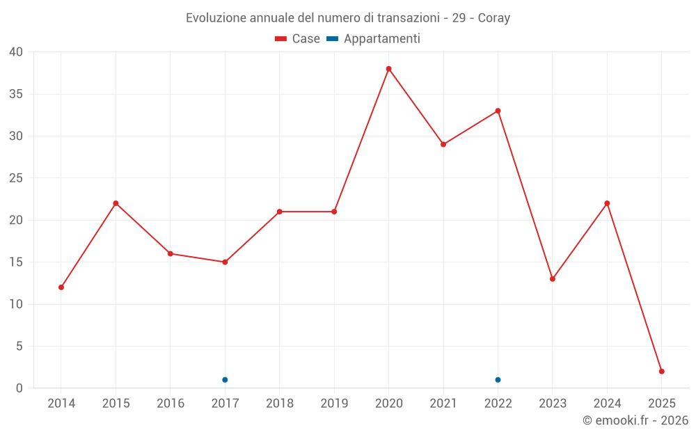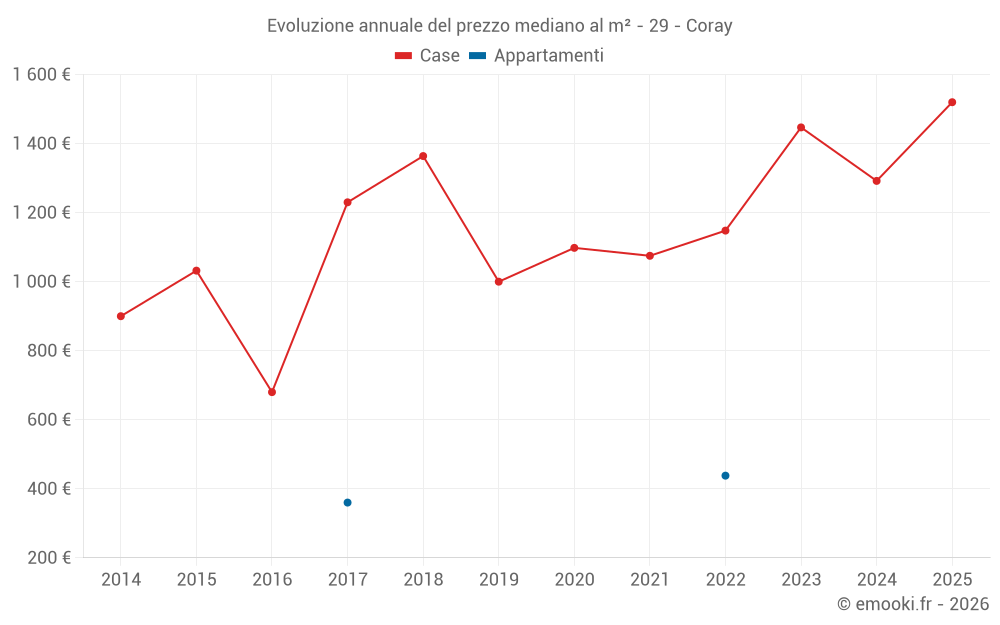 Il prezzo mediano sulle 30 transazioni di case degli ultimi 24 mesi nel comune di Coray era di 1 316 € al metro quadrato per un valore patrimoniale mediano di 141 500 €. In questo periodo il 60% delle transazioni era tra 804 e 1 645 € al metro quadrato (dal 2° all'8° decile).