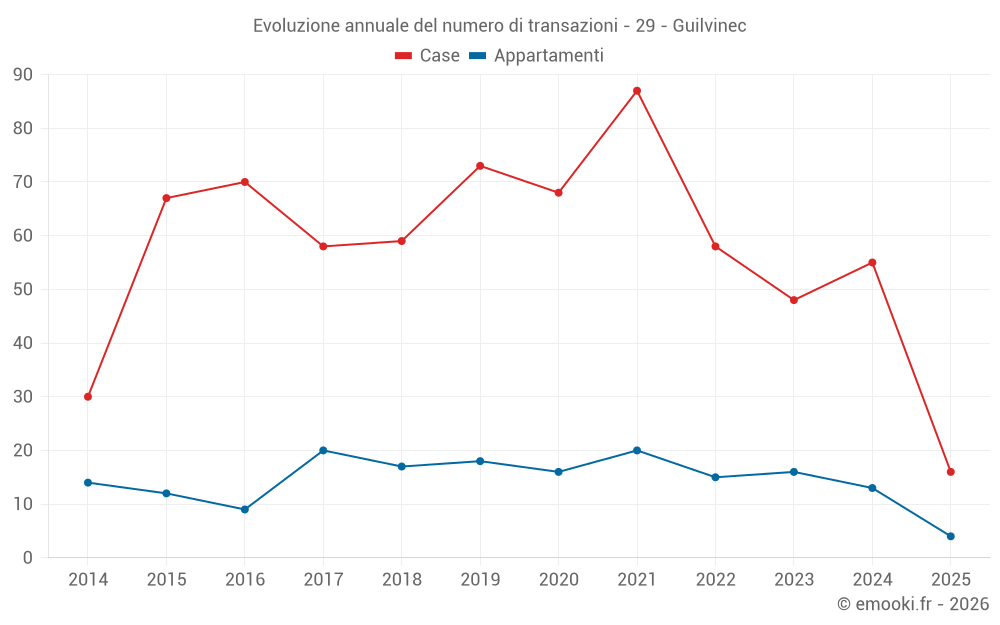 Il prezzo mediano sulle 26 transazioni di appartamenti degli ultimi 24 mesi nel comune di Guilvinec era di 2 467 € al metro quadrato per un valore patrimoniale mediano di 126 327 €. In questo periodo il 60% delle transazioni era tra 1 690 e 3 025 € al metro quadrato (dal 2° all'8° decile).