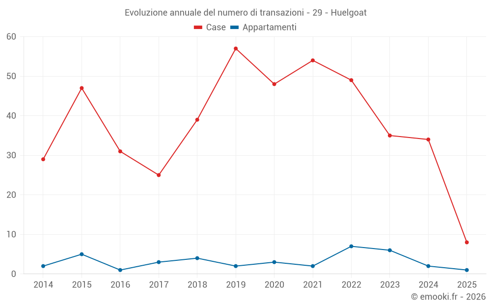 Il prezzo mediano sulle 30 transazioni di case degli ultimi 12 mesi nel comune di Huelgoat era di 1 375 € al metro quadrato per un valore patrimoniale mediano di 121 500 €. In questo periodo il 60% delle transazioni era tra 900 e 1 735 € al metro quadrato (dal 2° all'8° decile).