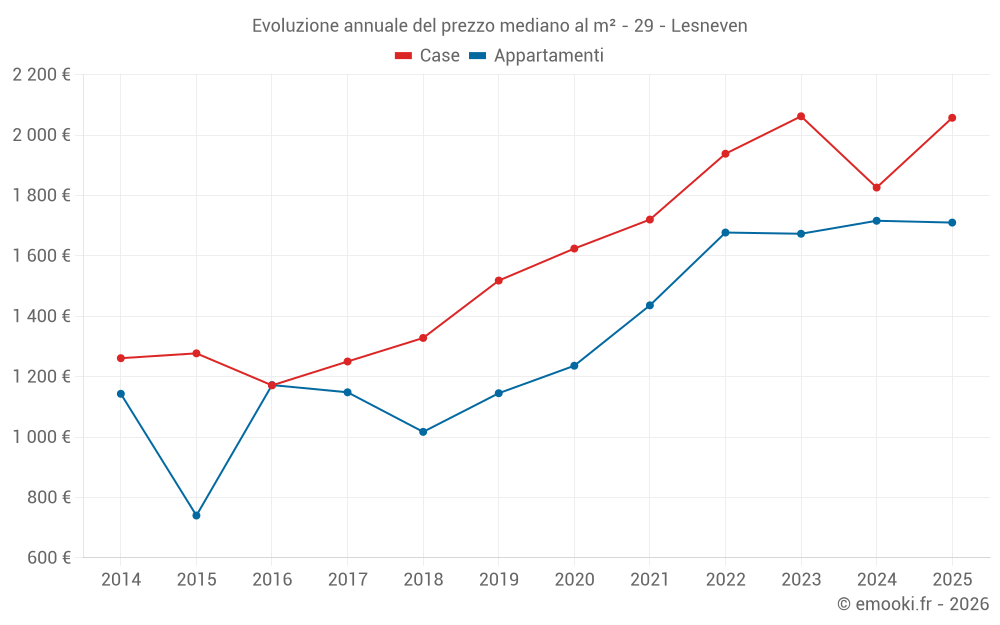 Il prezzo mediano sulle 22 transazioni di case degli ultimi 3 mesi nel comune di Lesneven era di 2 014 € al metro quadrato per un valore patrimoniale mediano di 224 600 €. In questo periodo il 60% delle transazioni era tra 1 682 e 2 298 € al metro quadrato (dal 2° all'8° decile).