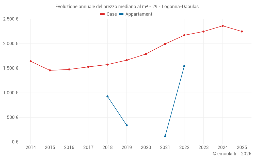Il prezzo mediano sulle 28 transazioni di case degli ultimi 12 mesi nel comune di Logonna-Daoulas era di 2 264 € al metro quadrato per un valore patrimoniale mediano di 178 525 €. In questo periodo il 60% delle transazioni era tra 1 351 e 2 971 € al metro quadrato (dal 2° all'8° decile).