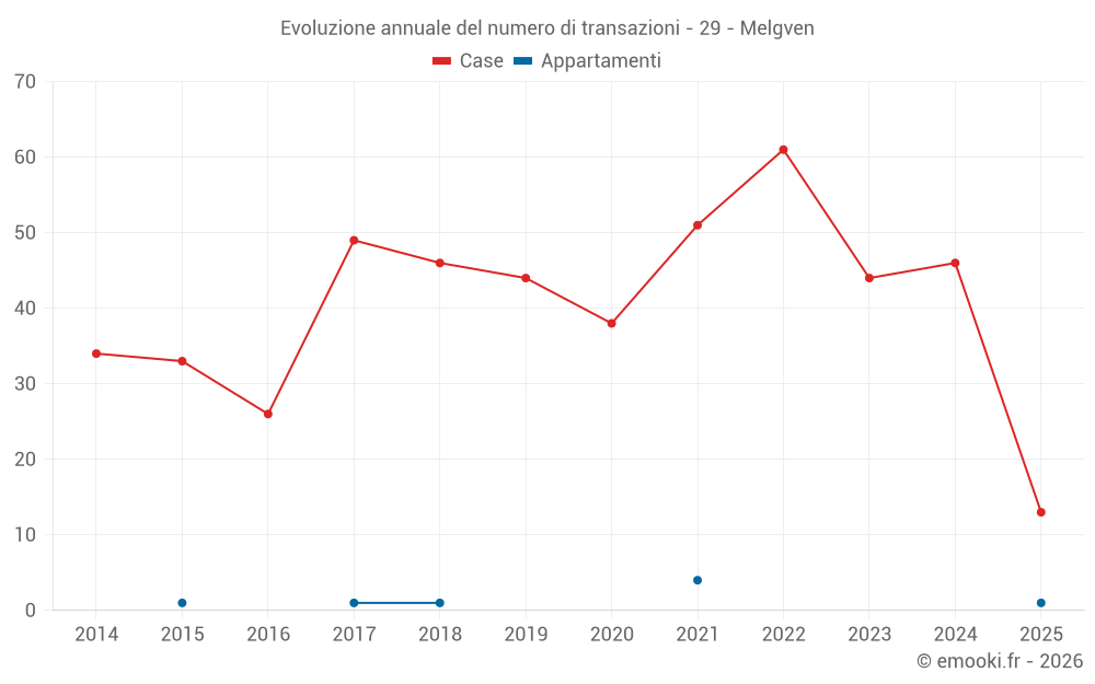 Il prezzo mediano sulle 39 transazioni di case degli ultimi 12 mesi nel comune di Melgven era di 2 087 € al metro quadrato per un valore patrimoniale mediano di 205 800 €. In questo periodo il 60% delle transazioni era tra 1 419 e 2 729 € al metro quadrato (dal 2° all'8° decile).