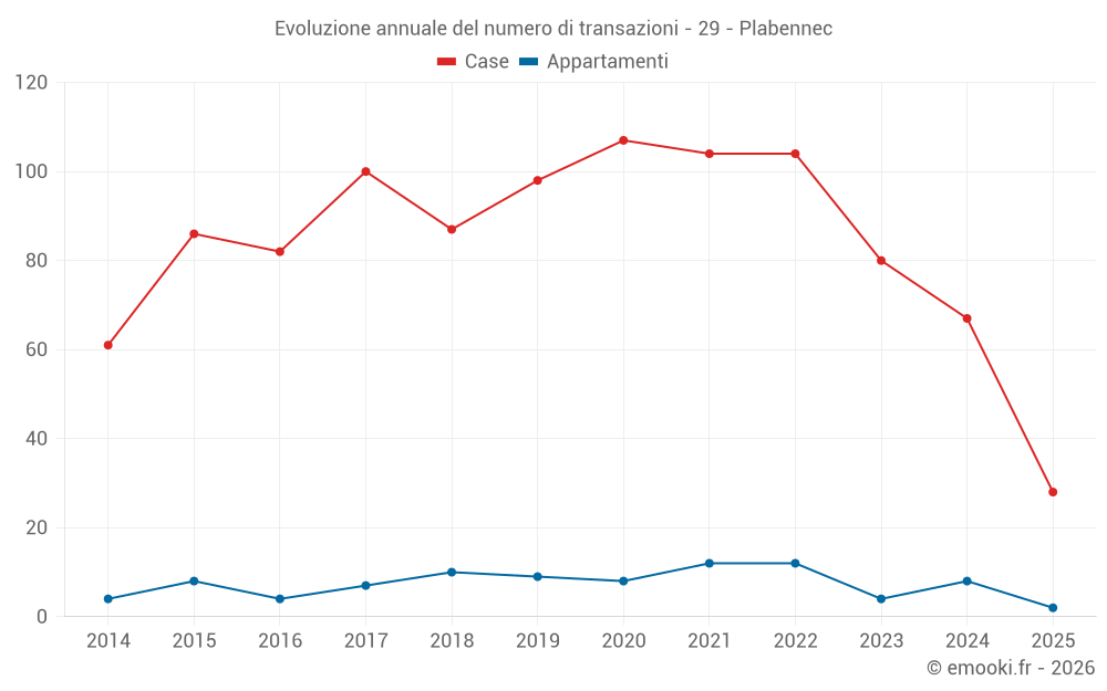 Il prezzo mediano sulle 28 transazioni di case degli ultimi 6 mesi nel comune di Plabennec era di 2 374 € al metro quadrato per un valore patrimoniale mediano di 226 000 €. In questo periodo il 60% delle transazioni era tra 1 700 e 2 741 € al metro quadrato (dal 2° all'8° decile).