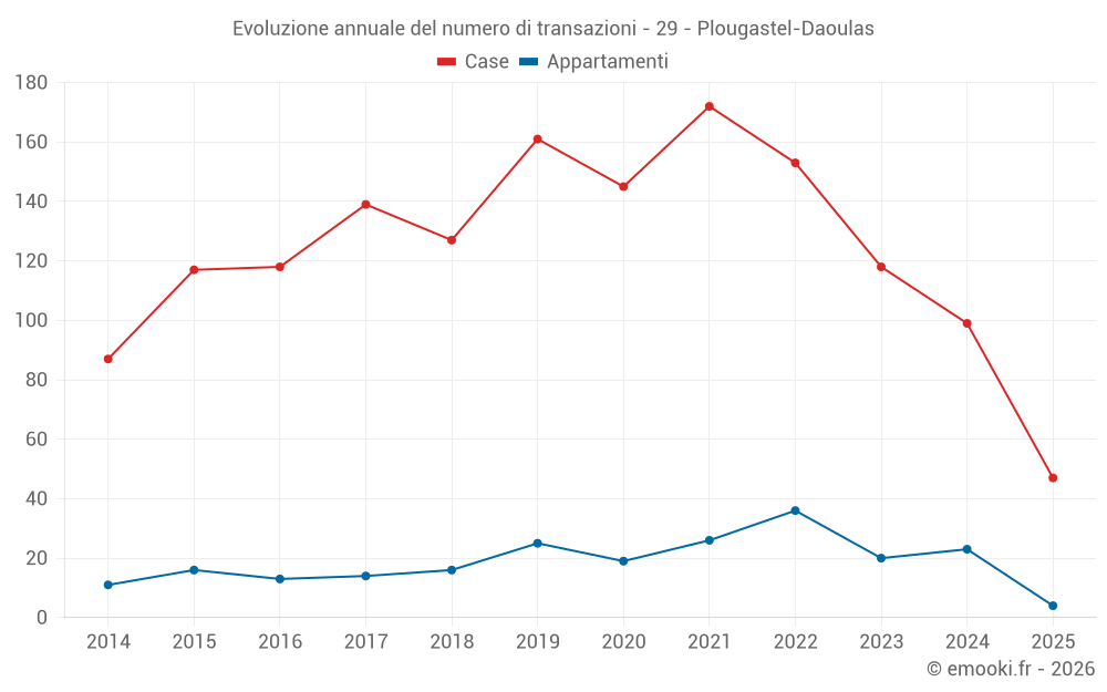 Il prezzo mediano sulle 20 transazioni di case degli ultimi 3 mesi nel comune di Plougastel-Daoulas era di 2 422 € al metro quadrato per un valore patrimoniale mediano di 230 424 €. In questo periodo il 60% delle transazioni era tra 1 899 e 3 370 € al metro quadrato (dal 2° all'8° decile).