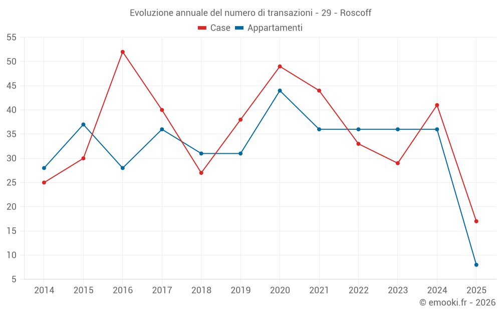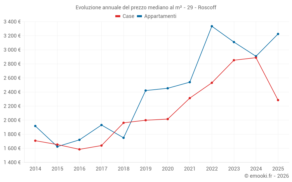Il prezzo mediano sulle 25 transazioni di appartamenti degli ultimi 12 mesi nel comune di Roscoff era di 2 849 € al metro quadrato per un valore patrimoniale mediano di 155 000 €. In questo periodo il 60% delle transazioni era tra 2 410 e 4 041 € al metro quadrato (dal 2° all'8° decile).