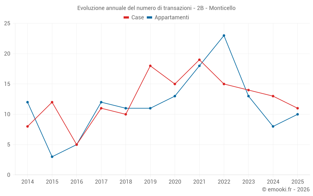 Il prezzo mediano sulle 18 transazioni di appartamenti degli ultimi 24 mesi nel comune di Monticello era di 4 674 € al metro quadrato per un valore patrimoniale mediano di 225 000 €. In questo periodo il 60% delle transazioni era tra 3 158 e 5 499 € al metro quadrato (dal 2° all'8° decile).