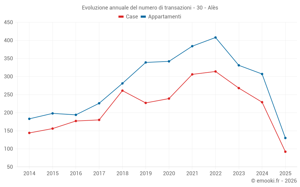 Il prezzo mediano sulle 45 transazioni di case degli ultimi 3 mesi nel comune di Alès era di 2 121 € al metro quadrato per un valore patrimoniale mediano di 180 000 €. In questo periodo il 60% delle transazioni era tra 1 551 e 2 511 € al metro quadrato (dal 2° all'8° decile).