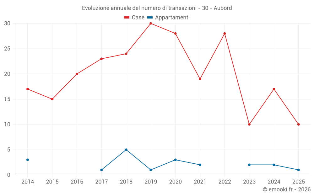 Il prezzo mediano sulle 20 transazioni di case degli ultimi 12 mesi nel comune di Aubord era di 2 795 € al metro quadrato per un valore patrimoniale mediano di 304 075 €. In questo periodo il 60% delle transazioni era tra 2 365 e 3 152 € al metro quadrato (dal 2° all'8° decile).