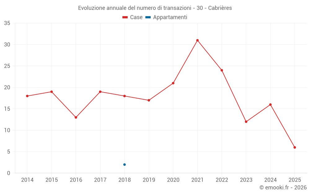 Il prezzo mediano sulle 16 transazioni di case degli ultimi 12 mesi nel comune di Cabrières era di 3 196 € al metro quadrato per un valore patrimoniale mediano di 261 225 €. In questo periodo il 60% delle transazioni era tra 2 722 e 3 388 € al metro quadrato (dal 2° all'8° decile).