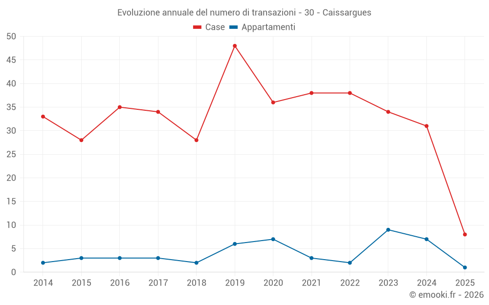 Il prezzo mediano sulle 29 transazioni di case degli ultimi 12 mesi nel comune di Caissargues era di 2 415 € al metro quadrato per un valore patrimoniale mediano di 252 000 €. In questo periodo il 60% delle transazioni era tra 2 039 e 3 154 € al metro quadrato (dal 2° all'8° decile).