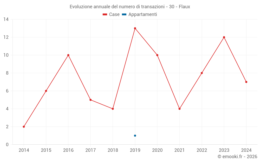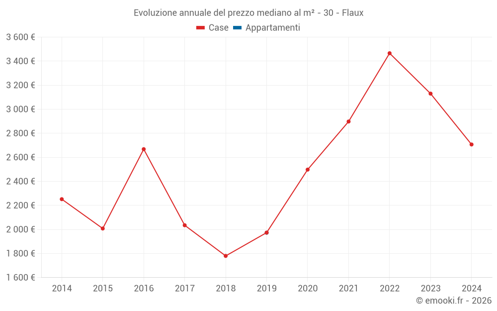 Il prezzo mediano sulle 15 transazioni di case degli ultimi 24 mesi nel comune di Flaux era di 2 756 € al metro quadrato per un valore patrimoniale mediano di 321 000 €. In questo periodo il 60% delle transazioni era tra 1 732 e 4 061 € al metro quadrato (dal 2° all'8° decile).
