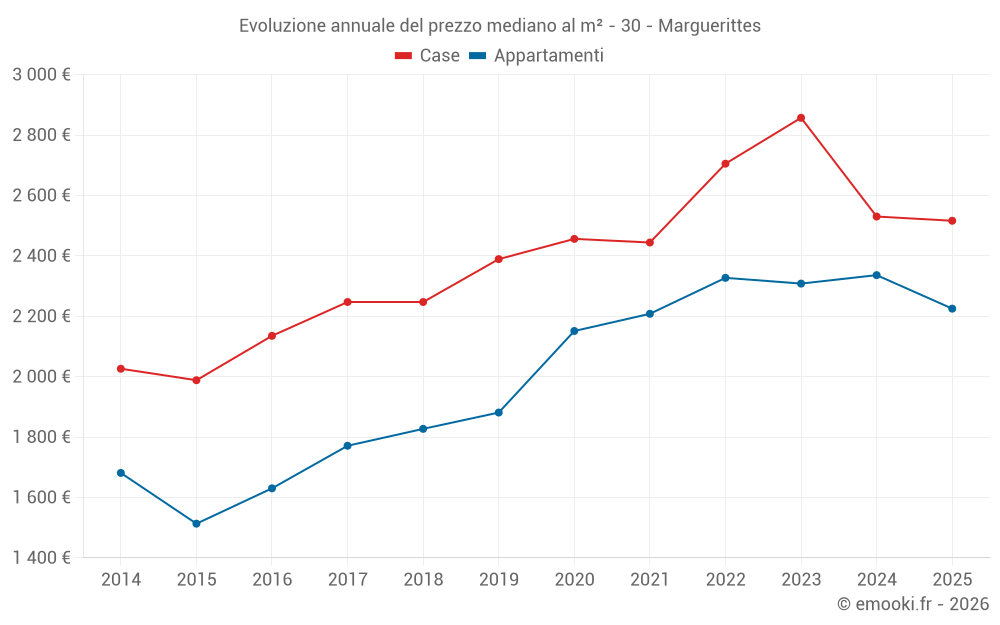 Il prezzo mediano sulle 29 transazioni di case degli ultimi 6 mesi nel comune di Marguerittes era di 2 516 € al metro quadrato per un valore patrimoniale mediano di 231 260 €. In questo periodo il 60% delle transazioni era tra 1 871 e 2 989 € al metro quadrato (dal 2° all'8° decile).
