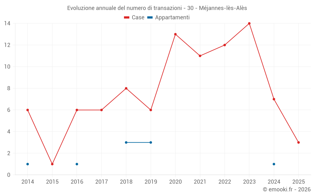 Il prezzo mediano sulle 14 transazioni di case degli ultimi 24 mesi nel comune di Méjannes-lès-Alès era di 1 808 € al metro quadrato per un valore patrimoniale mediano di 201 100 €. In questo periodo il 60% delle transazioni era tra 1 068 e 2 600 € al metro quadrato (dal 2° all'8° decile).