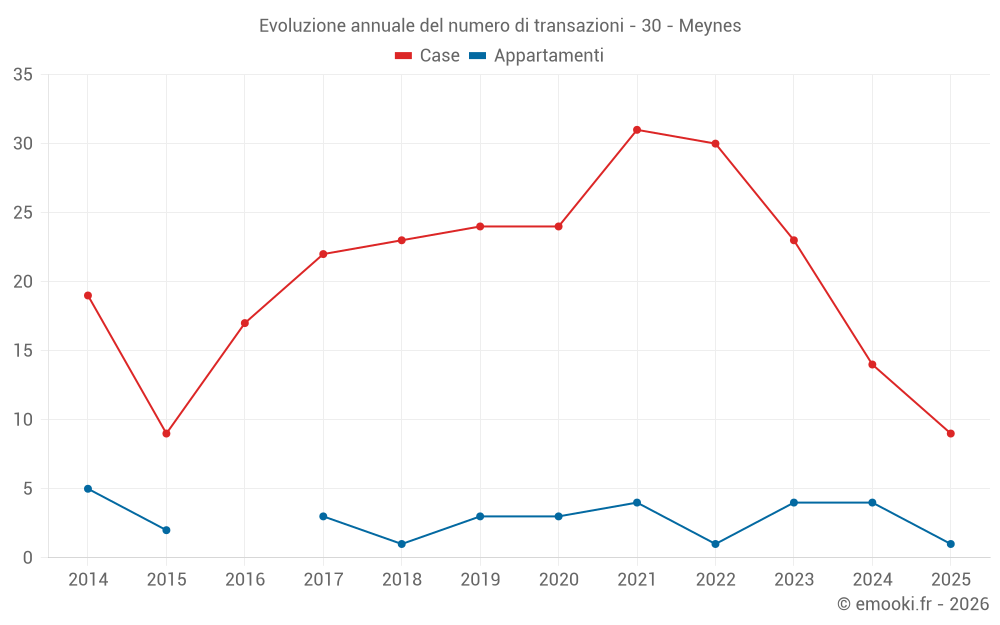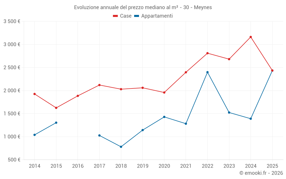 Il prezzo mediano sulle 31 transazioni di case degli ultimi 24 mesi nel comune di Meynes era di 3 000 € al metro quadrato per un valore patrimoniale mediano di 247 993 €. In questo periodo il 60% delle transazioni era tra 1 963 e 3 280 € al metro quadrato (dal 2° all'8° decile).