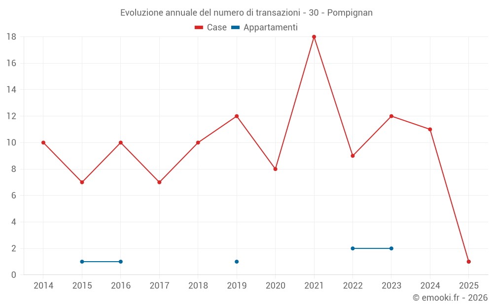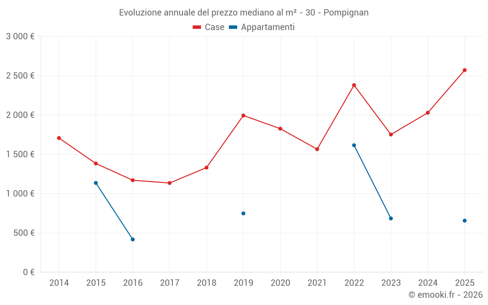Il prezzo mediano sulle 18 transazioni di case degli ultimi 24 mesi nel comune di Pompignan era di 2 170 € al metro quadrato per un valore patrimoniale mediano di 212 750 €. In questo periodo il 60% delle transazioni era tra 1 242 e 3 086 € al metro quadrato (dal 2° all'8° decile).