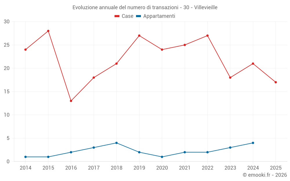 Il prezzo mediano sulle 30 transazioni di case degli ultimi 12 mesi nel comune di Villevieille era di 2 862 € al metro quadrato per un valore patrimoniale mediano di 273 750 €. In questo periodo il 60% delle transazioni era tra 2 569 e 3 632 € al metro quadrato (dal 2° all'8° decile).