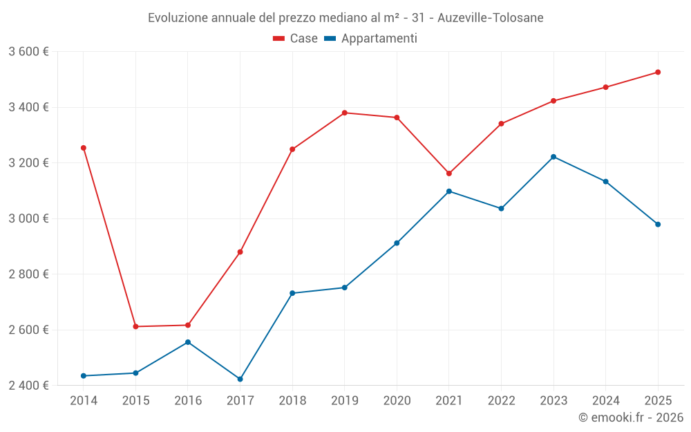 Il prezzo mediano sulle 25 transazioni di appartamenti degli ultimi 12 mesi nel comune di Auzeville-Tolosane era di 3 078 € al metro quadrato per un valore patrimoniale mediano di 83 000 €. In questo periodo il 60% delle transazioni era tra 2 768 e 3 317 € al metro quadrato (dal 2° all'8° decile).