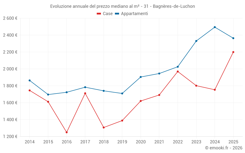 Il prezzo mediano sulle 21 transazioni di case degli ultimi 12 mesi nel comune di Bagnères-de-Luchon era di 1 658 € al metro quadrato per un valore patrimoniale mediano di 237 760 €. In questo periodo il 60% delle transazioni era tra 948 e 2 642 € al metro quadrato (dal 2° all'8° decile).