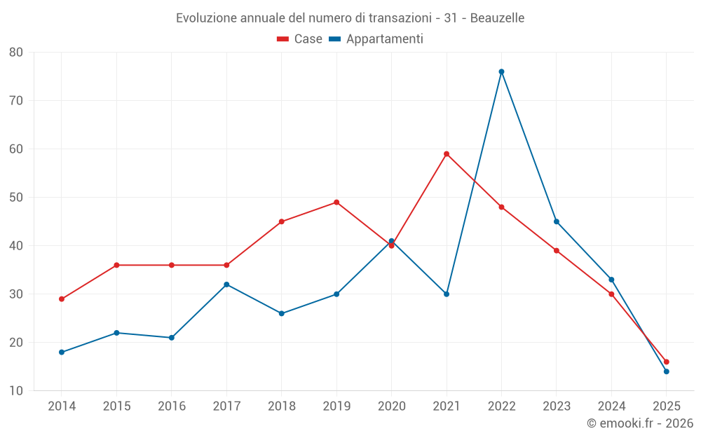 Il prezzo mediano sulle 38 transazioni di case degli ultimi 12 mesi nel comune di Beauzelle era di 3 256 € al metro quadrato per un valore patrimoniale mediano di 312 368 €. In questo periodo il 60% delle transazioni era tra 2 624 e 3 811 € al metro quadrato (dal 2° all'8° decile).