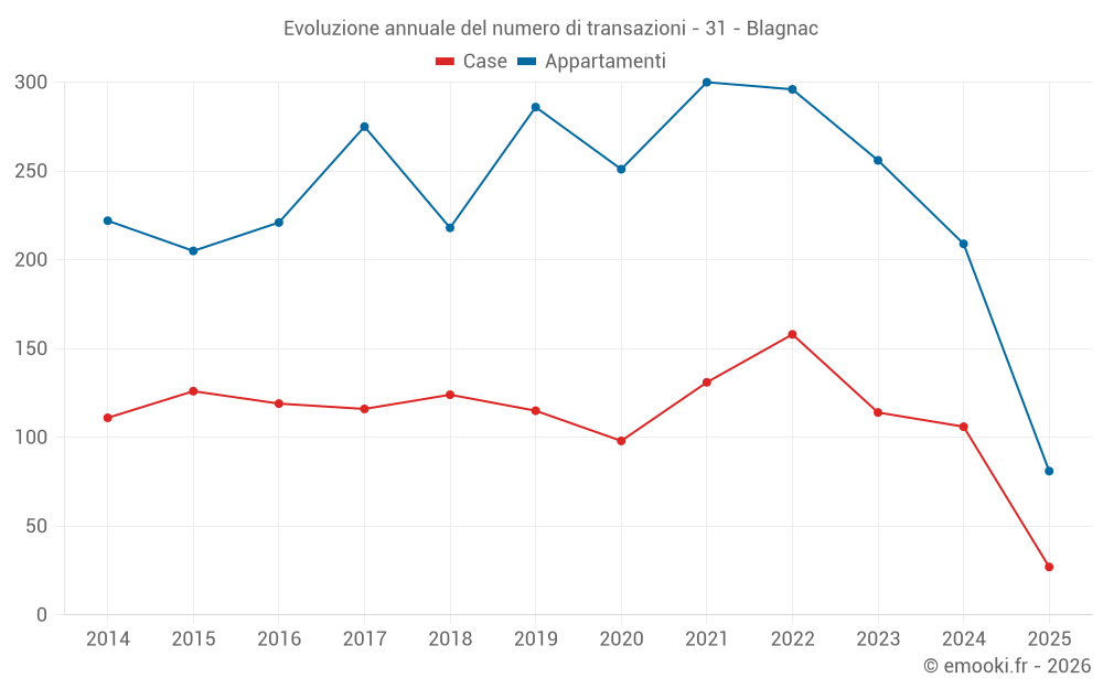Il prezzo mediano sulle 27 transazioni di case degli ultimi 6 mesi nel comune di Blagnac era di 3 304 € al metro quadrato per un valore patrimoniale mediano di 315 000 €. In questo periodo il 60% delle transazioni era tra 2 621 e 4 196 € al metro quadrato (dal 2° all'8° decile).